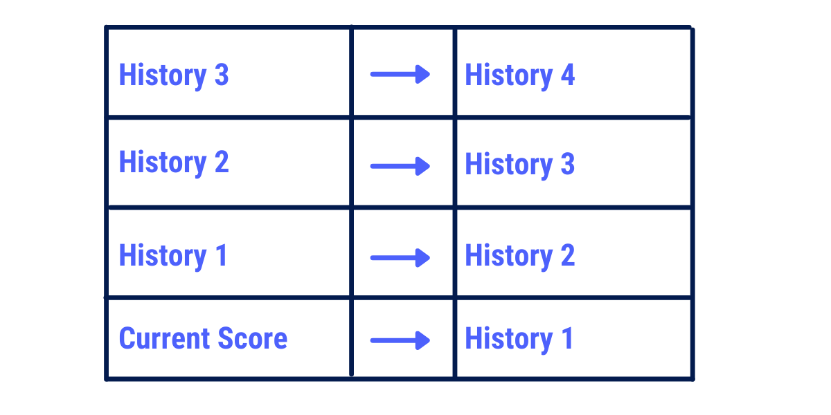This moves the current score to the first history placeholder, the theory being that once the game stops, the following happens;