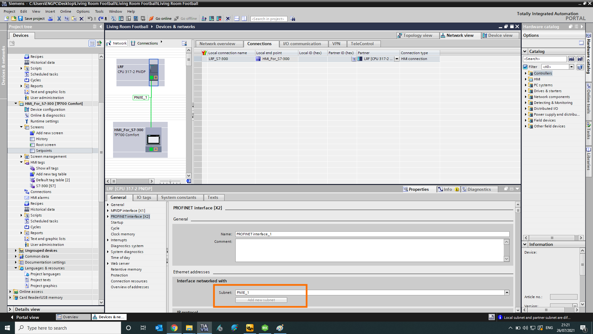 This is the first in a series of tutorials where we’re going to create a project to keep the score in a football (aka soccer) match. This will help you understand how to begin a project from scratch and accomplish all the aspects required; linking a Siemens S7-300 CPU 317-2 PN/DP PLC to a Siemens TP700 Series 7 inch Touch Screen HMI, writing the PLC code and designing and building the HMI project.