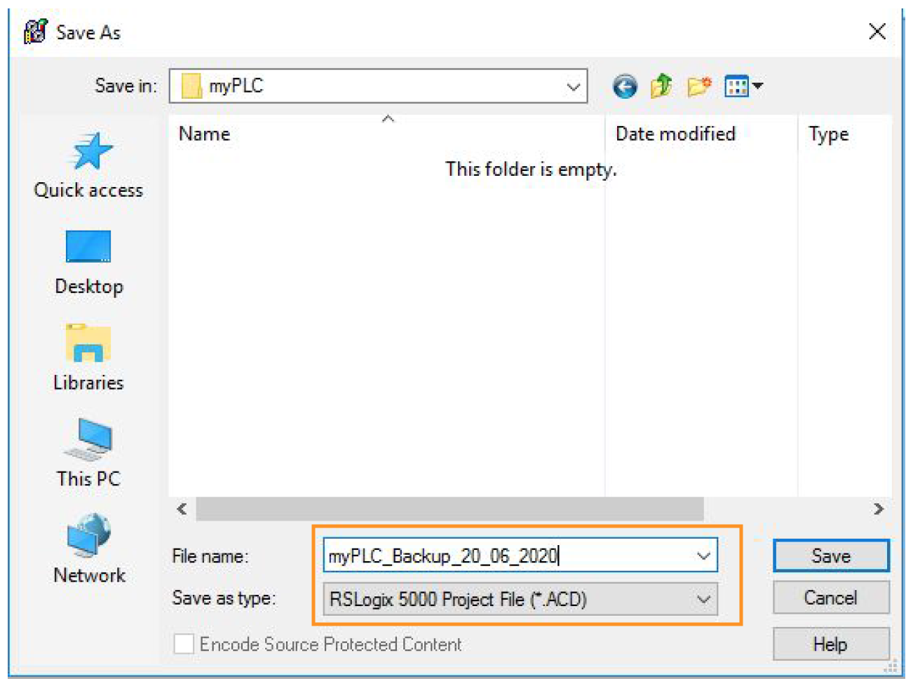 - Browse to the folder where you want to save the file and give it a file name like ‘myPLC_Backup_CurrentDate’