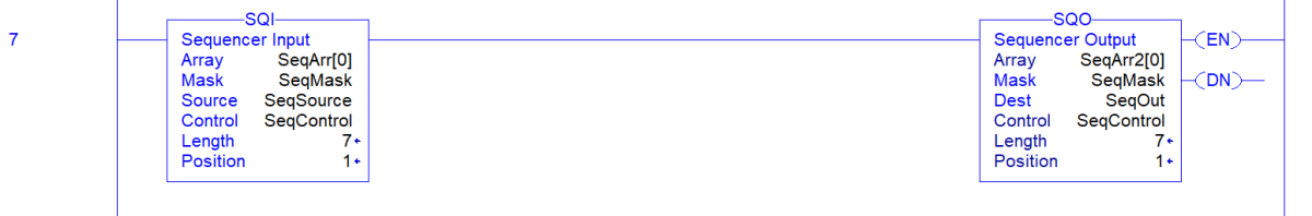 The solution is to use the pre-defined RSLogix / Studio 500 & 5000 Instructions SQI and SQO; sequencer input and sequencer output respectively. These instructions standardize & simplify the creation of the logic discussed above. They give the programmer a simple way to define the number of steps the sequencer needs to go through, which inputs & outputs need to be energized and provide a clear path to modifying current steps in order to accommodate new code or scaling.