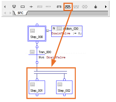 Divergence in Sequential Function Charts, as explained in the previous examples, dealt with the splitting of a single path from either a step or transition into multiple branches to following steps or transitions.
