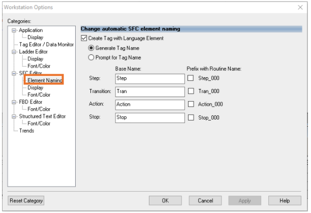 Navigating to ‘Element Naming’ In the ‘Workstation Options Window’ that appears, the interface appears where customization of these defaults may be altered.