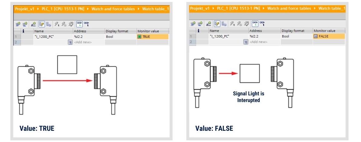 The specified photoelectric cell is configured in the light mode in the present scenario. As functionality has been determined, we can proceed to check the input. We expect the input to be TRUE when there is nothing in the way of the sensor and the reflector. If this is not the case, and we have confirmed that the mode setting is correct, another thing to look for is mechanical alignment between the photoelectric cell and the reflector. It should be aligned so that the light beam is directed straight to the reflector and then back to the photoelectric cell.