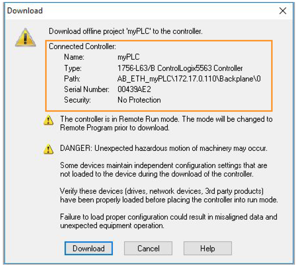 Now that a backup has been made, it is useful to go through the process of restoring this backup. As stated previously, this may be done when failures have occurred or if the need arises to revert to a previous version. It is also worth mentioning, that a backup may be used to change bulk PLC code that can be tedious while online and may then be downloaded using the following process.