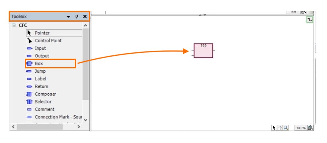 Next, we will drag a box from the Toolbox on the right as shown. Then we will enter the block from the library by typing inside the box for example “ADD”. You can assign the input and output pins by double-clicking and selecting the variables from the global variable list (GVL).