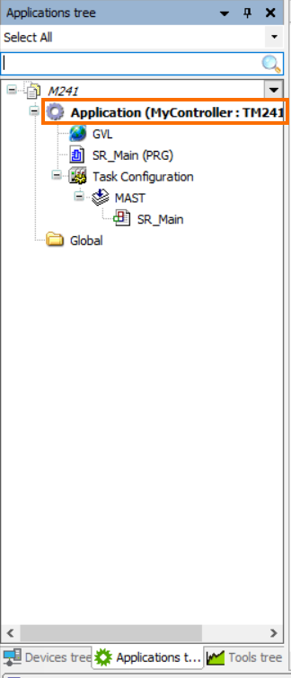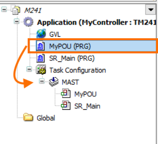 At this stage, we will add the POU created in the previous step to the Task Configuration. A POU must be added to the Task Configuration in order for it to be executed. In the Applications tree, select the MyPOU and while holding it with the mouse, drag it under the MAST.