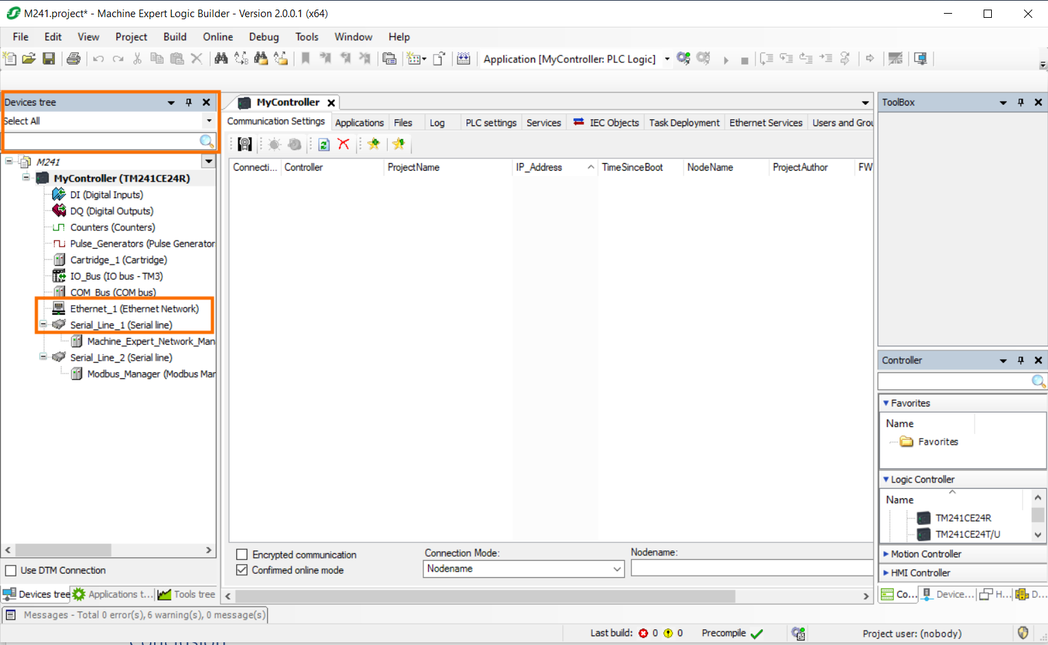Once the project is created, we will start with configuring the ethernet communication by assigning an IP address to the controller. Select the “Devices tree” tab in the navigator window, and double click the Ethernet_1 (Ethernet Network) option.