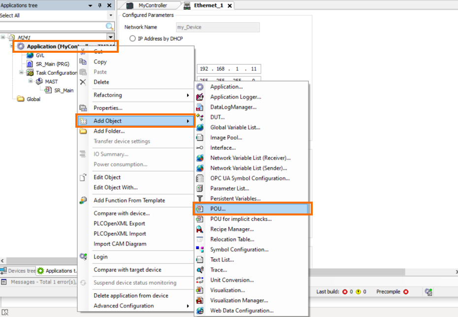 Right click on the Application (MyController:TM241CE24R) option and select Add Object. The Add Object option will expand into a sub-menu where we can choose POU.