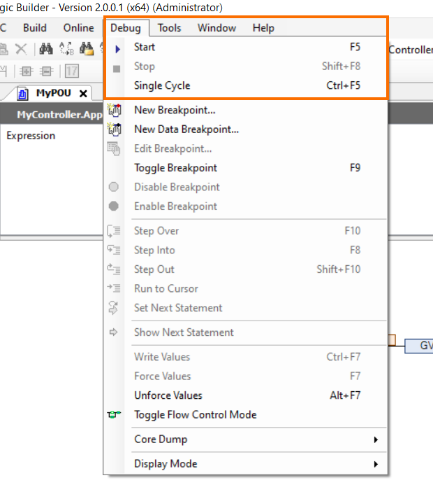 To change the PLC to run mode, we will select the ‘Debug’ menu and select ‘Start’.