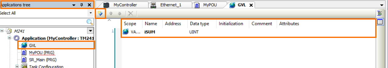 In the Applications tree, double click the GVL option and this will open a Global Variable List. This is where we will create a new variable called iSum.