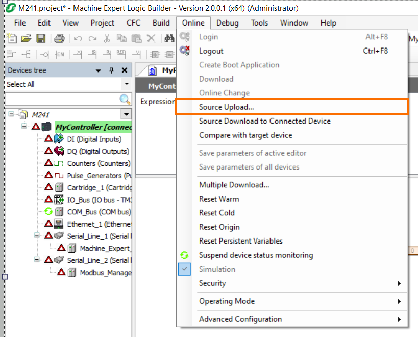 After we have completed the previous step, we will connect to the controller by accessing the Online menu from the menu bar. Select Login from the drop-down menu.