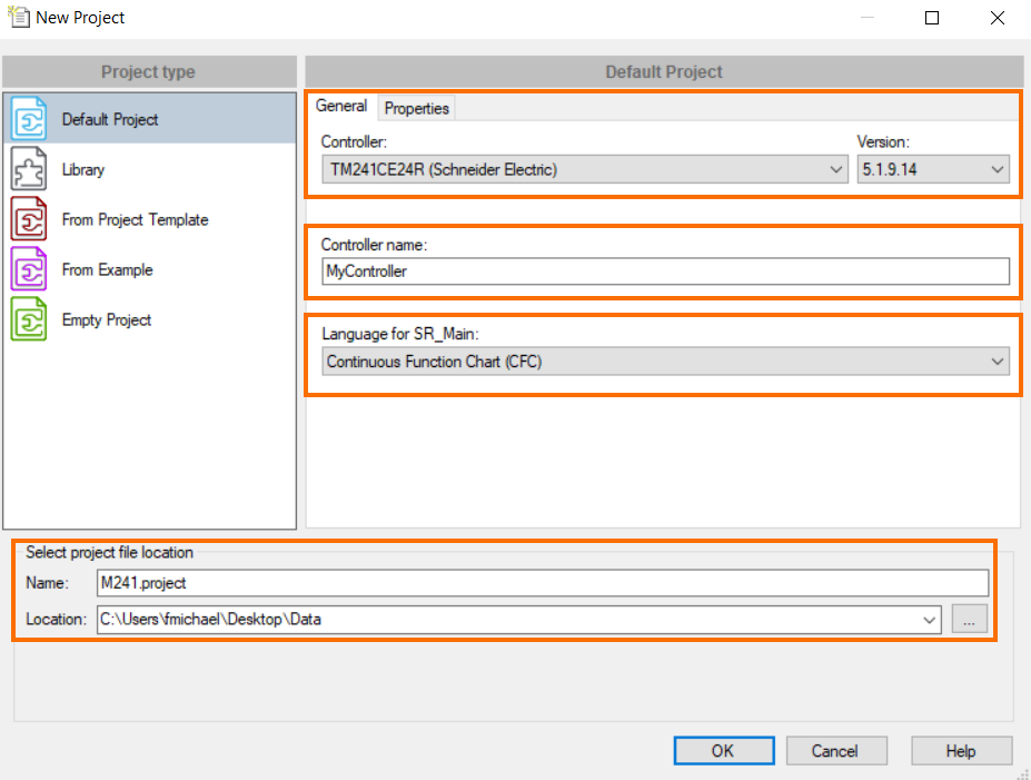Once open, we will select File>>New Project. A new project window will open. We will select a controller (TM241CE24R), programming language, and give it a name.