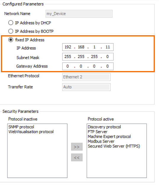 Once the Ethernet_1 parameter window is open, input the IP address, Subnet Mask and Gateway address if needed.