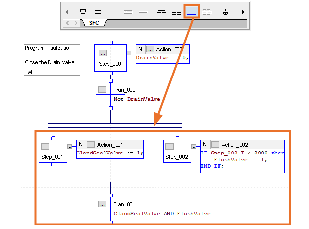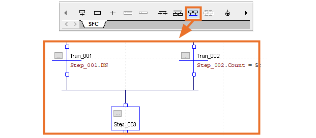 The other type of convergence happens when multiple steps use the same transition. The ‘Converge Selected SFC Elements’ may also be used to achieve this.