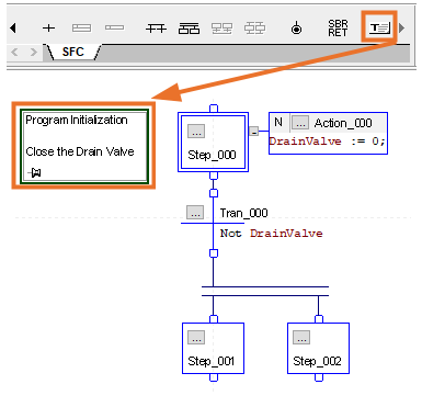 Graphical SFC elements are placed in the drawing space. This space has a grid structure in a spreadsheet like style, as can clearly be seen by the column (A, B, …) and row (1, 2, …) markers. The icons around the drawing space also change to accommodate the SFC environment:
