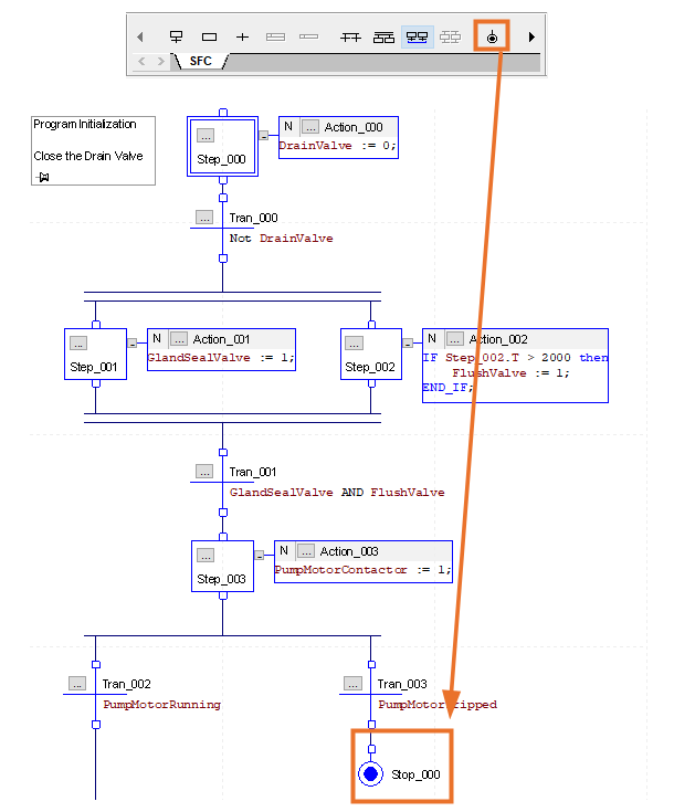 The ‘Add Stop’ may be used in the toolbar to add a ‘Stop’ Element. The tag associated with this element uses the ‘SFC_STOP’ data type structure. A stop may be used at the end of a Sequential Function Chart routine, or on a branch leg as in the example.