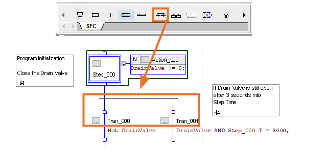 Thus far we have covered the basic Sequential Function Chart Elements, but it can clearly be seen from the SFC Toolbar, that there are a few variations that these elements may be used. In the event that two or more steps need to occur after a transition, a ‘Simultaneous Branch Diverge’ may be used.