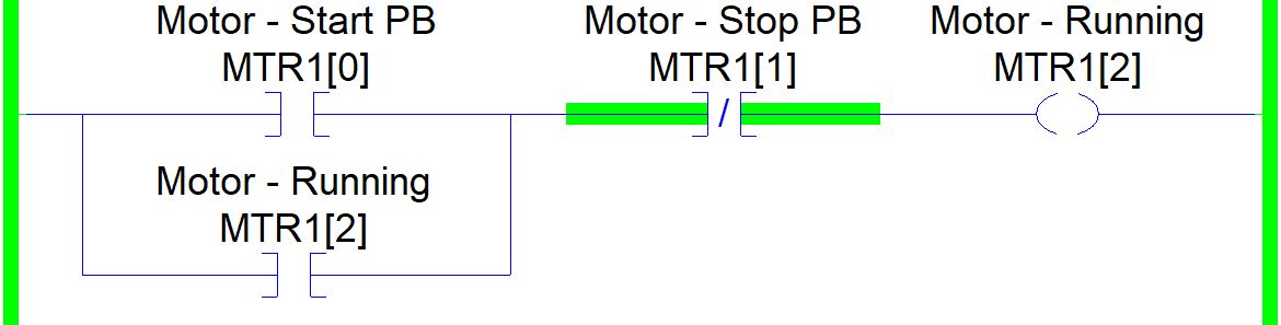 The basic motor starter circuit often comes up in interviews. It's the easiest way to gauge basic PLCÂ knowledge and see how a candidate adapts to the challenge, expands on it and discusses ways to use it in an application. Below is a simple implementation in ladder logic.