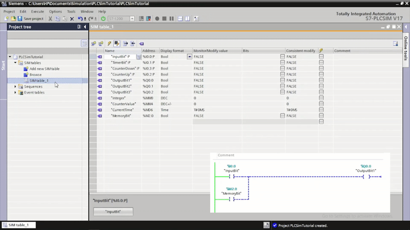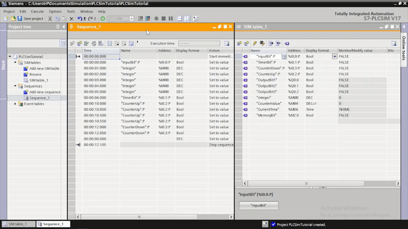 PLCSim’s Project view and SIM tables
